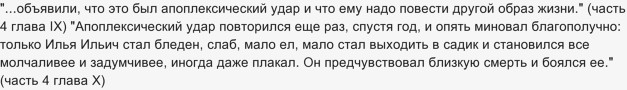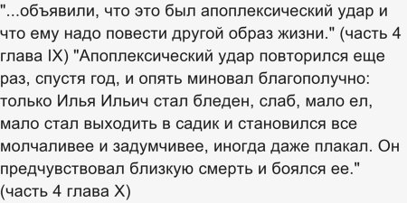 Как известно, герой романа в конце умирает. К сожалению, дату смерти автор не указывает так точно, как возраст героя в начале романа. Это можно лишь высчитать по некоторым приведенным событиям. Обломов умирает от инсульта, а вернее их было несколько. Отсутствие активности, в большинстве своем лежачий образ жизни и приводят к этим инсультам.