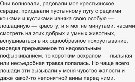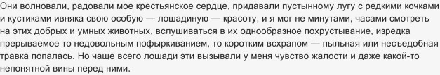6) Главный герой сам из крестьян, поэтому радуется, наблюдая лошадей, но переживает, глядя на их непростую жизнь. Он любит этих животных, которые трудятся на человека, любуется красивыми созданиями.