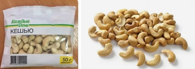 Обычно продают по 100-200 грамм кешью. Форма у них изогнутая, а сам орех примерно одинаковый.