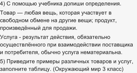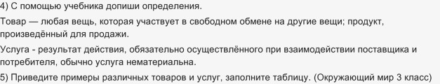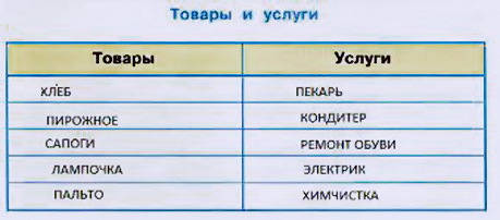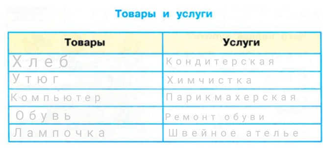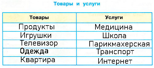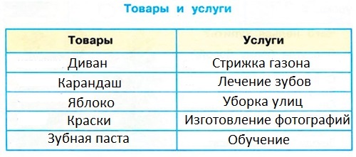 5) Приведите примеры различных товаров и услуг, заполните таблицу. (Окружающий мир 3 класс)