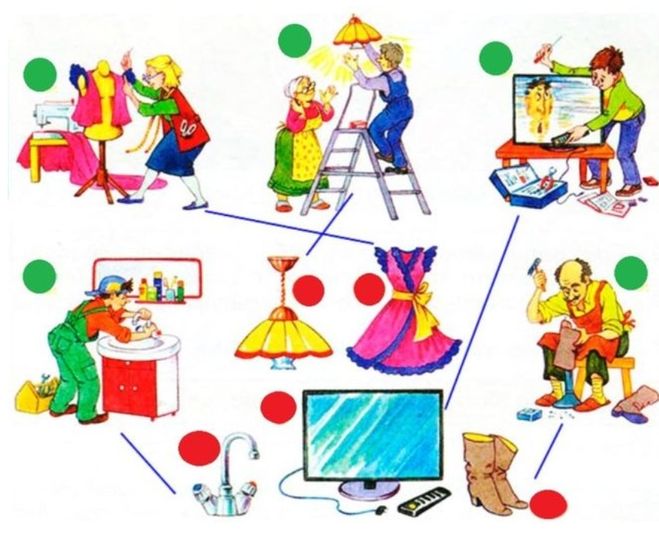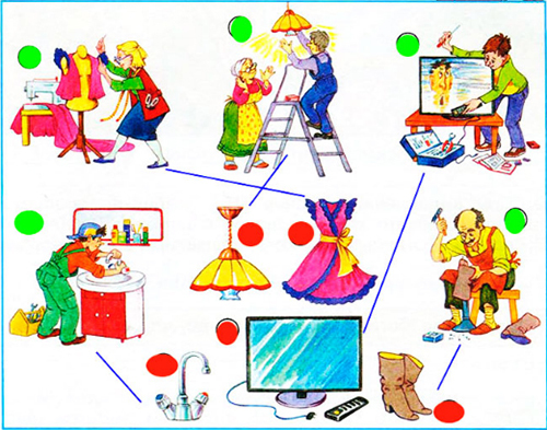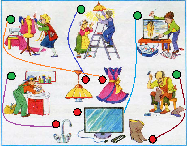 В следующем задании надо закрасить зеленым все картинки с людьми (это услуги) и красным предметы. Соответственно, линиями соединяем портниху и платье, электрика и лампу, настройщика телевизора и телевизор, обувщика и обувь, сантехника и кран.