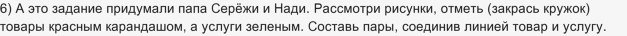 6) А это задание придумали папа Серёжи и Нади. Рассмотри рисунки, отметь (закрась кружок) товары красным карандашом, а услуги зеленым. Составь пары, соединив линией товар и услугу.