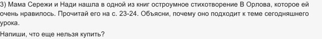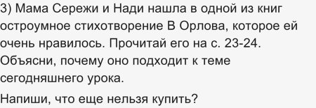 3) Мама Сережи и Нади нашла в одной из книг остроумное стихотворение В Орлова, которое ей очень нравилось. Прочитай его на с. 23-24. Объясни, почему оно подходит к теме сегодняшнего урока.