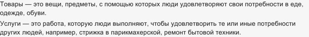 Товары - материальные ценности, необходимые для удовлетворения потребностей. Услуги - действия других людей, которые оплачиваются человеком с той же целью.
