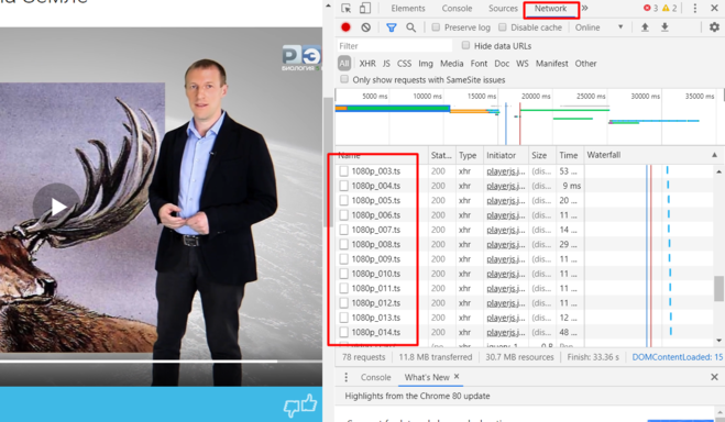 Как всегда дл начала нам нужно зайти на этот сайт, далее находим видеоурок, который хотим скачать. Дальше нажимаем клавишу F12 и перезагружаем страничку. Следующие наши действия: находим раздел "Network", смотрим в столбцах файлы, нужные нам файлы начинаются 720p или 1080p, формат - .ts.