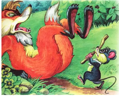 Зато маленький мышонок, предупрежденный зайцем, проявил смелость и первым атаковал лиса. Именно он и закричал: