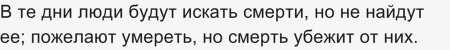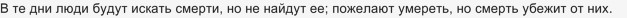 6 В те дни люди будут искать смерти, но не найдут её; пожелают умереть, но смерть убежит от них.