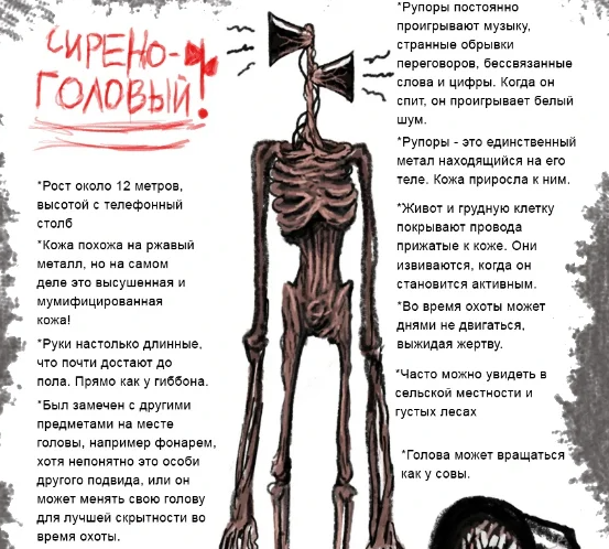 Новая страшилка, которая набирает популярность и имя автора му сиреноголовый. От слова сирена, то, что издает звуки, но не всегда монотонные. Сиреноголовый - это детище арт- художника из Канады Сайрена Хед Тревора Хендерсона. Гуманоидные существо высотой более 12 метров. Вместо головы два мегафона, которыми он и "вещает", вместо грудной клетки куча перепутанных проводов , обтянутых кожей, как мумия и необяюычайно высокие ноги, и руки, почти достающие до земли.