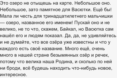 Пока Васютка блуждал по лесу, он наткнулся на озеро, о котором местные жители или не знали, или давно забыли. Десятилетиями нетронутое, оно сохранило богатую экосистему - в нем плавало на удивление много рыбы.