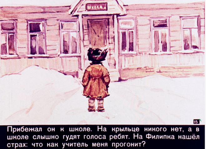 В школе было много детей и Филипка охватила робость.Он побоялся, что учитель его прогонит. Но учитель просто спросил у других ребят кто к ним пришел, и ребята ему ответили, что это пришел брат Костюшкин и мальчика зовут Филиппок.