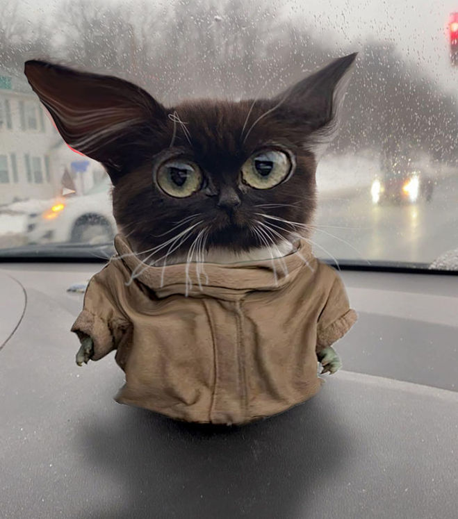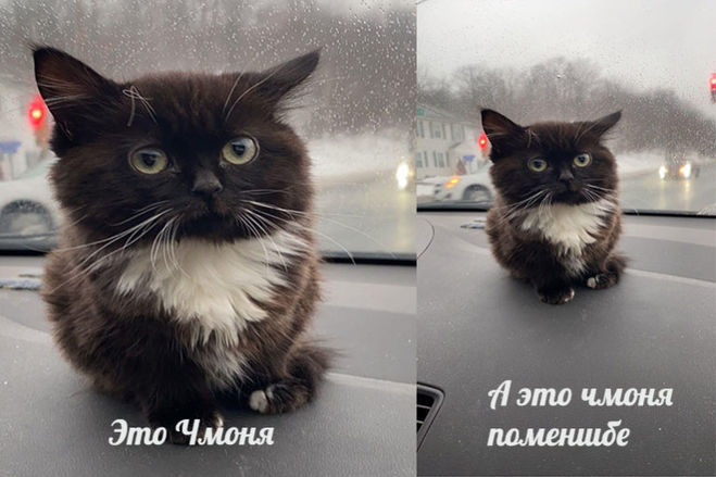 Фото черно-белого котенка, сидящего на торпеде автомобиля, мелькает в сети с начала 2021 года. Кадр появился в феврале 2021, фото сперва разлетелось по Твиттеру, затем стало объектом для фотожаб.