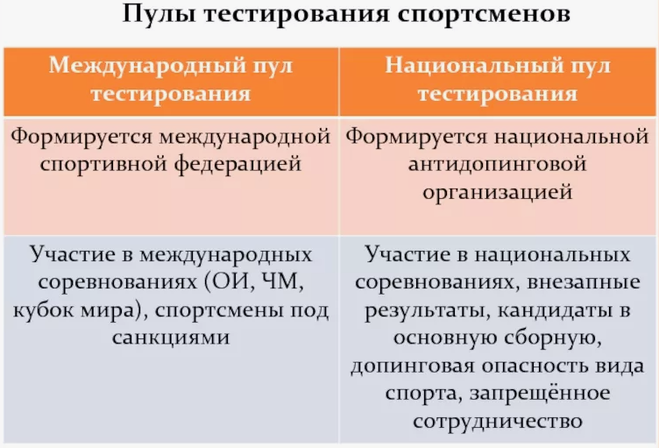 Теперь о видах пулов. Кроме того, что они могут формироваться от федераций определённого вида спорта (национальная принадлежность второстепенна в этот момент), их могут составлять (списки) и на национальном уровне. Например, на данный момент на сайте РУСАДА висят актульные списки спортсменов, которые могут быть отправлены на тестирование.