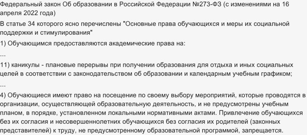 Поэтому всё достаточно просто, можно спокойно отказаться и не ходить ни на какие отработки. Школьные работники вправе предлагать, мотивировать, просить, но заставлять и наказывать они не могут. Правда, сейчас в учебную программу входят иногда субботники, благоустройство самой школы, трудовые десанты, и тогда отказаться будет сложнее, тем более что минимальная продолжительность летних каникул 2, а не 3 месяца, как многие думают.