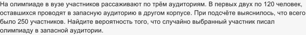 Вероятность, что участник будет писать олимпиаду в запасной аудитории равна: 10 / 250 = 0,04.