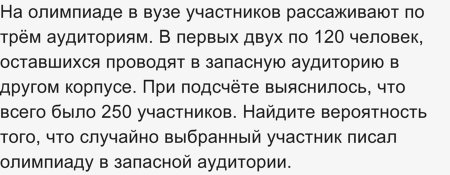 На олимпиаде в вузе участников рассаживают по трём аудиториям. В первых двух по 120 человек, оставшихся проводят в запасную аудиторию в другом корпусе. При подсчёте выяснилось, что всего было 250 участников. Найдите вероятность того, что случайно выбранный участник писал олимпиаду в запасной аудитории.