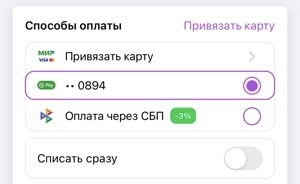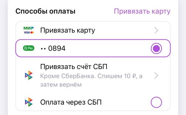 Привязать несложно и это быстро. В способах оплаты выбрать "Привязать по СБП". Далее потребуется выбрать карту и подтвердить. При привязке на карте должно быть 10 рублей, они будут списаны, но чуть позже они будут возвращены обратно на карту.