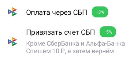 Первая - это оплата через СБП и она составляет 3%, вторая - это привязка счёта СБП и если вы это сделаете у вас окажется скидка в 5%.