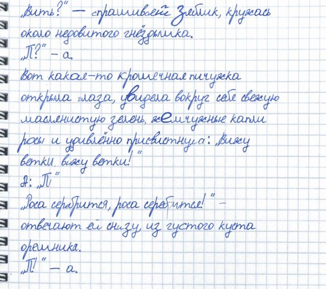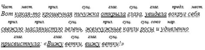 Утреннее пение птиц нестройно и торопливо, но именно в этой торопливости, в перебоях и переливах разноголосья вся новизна3 лесного летнего утра. Вот какая-то крошечная пичужка открыла глаза, увидела вокруг себя свежую маслянистую зелень, жемчужные капли росы и удивлённо присвистнула: «Вижу ветки, вижу ветки!»4 А другая уже взвилась над макушкой дерева, зажмурилась от блеснувшего света и поспешила оповестить: «Солнце! Солнце встаёт! - «Роса серебрится, роса серебрится!» - отвечают ей снизу, из густого куста орешника.5 «Вить?» - спрашивает зяблик, кружась около недавнюю гнёздышка. - «Вить, вить!» - торопливо отвечают ему. И он, принявшись за дело, свищет на всю опушку: Вью1, вью...» Птицы щебечут, свистят, щёлкают, перебивают друг друга, наполнят лес суетой и гомоном пробуждения.