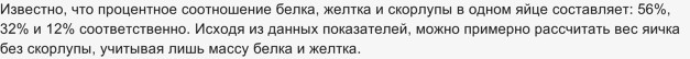 Ведь известно, что куриное яйцо имеет следующий состав: белок – 58,5%; скорлупа – 11,5% и желток – 30%.