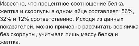 Ну а сколько такия яйца будут непосредственно весить без скорлупы можнл легко и самим посчитать, но опять данные буду колебаться в определенных границах. И вот что нужно для расчета веса яйца без скорлупы.