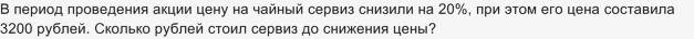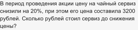 Как решить: цену на чайный сервиз снизили на 20%, его цена составила 3200?