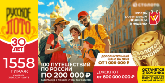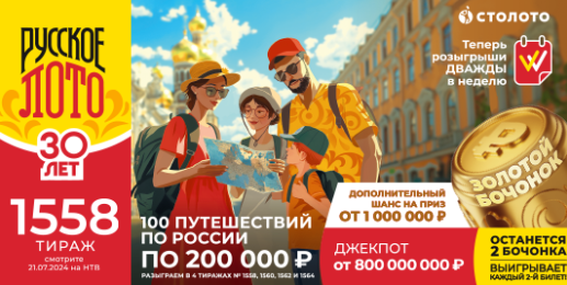 Тираж 1558 лотереи Русское лото будет разыгран 21 июля 12024 года. Тиражи Русского лото в последние месяцы выходят с различными дополнительными "плюшками" для игроков, ведь в текущем 2024 году Русскому лото исполняется 30 лет. И это самая старая российская лотерея. Первый тираж Русского лото был разыгран в 1994 году. В тираже 1558 будут разыграны путешествия по России в количестве 100 путешествий стоимостью 200 тысяч каждое путешествие. Будет разыграно и много других денежных призов меньшей суммы, но тоже приятных. Возможно и Золотой бочонок будет разыгран и Джекпот тоже.