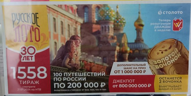 В самый разгар лета, а точнее 21-ого июля 2024-ого года на телеканале НТВ состоится очередной уже 1558-ой тираж лотереи "Русское лото". Если улыбнется удача, то можно выиграть одно из ста путешествий по России в эквиваленте по 200 тысяч рублей, дежурный джек-пот от 800 миллионов рублей, да и стало уже дело привычным - дополнительный розыгрыш "Золотой бочонок".