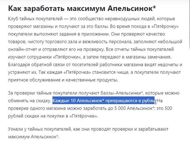 Например, мне иногда предлагают купить продуктов в Пятерочке на 600 рублей и за это начислят 1000 апельсинок, это 100 рублей.
