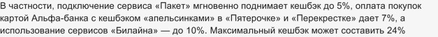 Ранее головная компания Х5 Ритейл групп развивала свои системы лояльности для покупателей отдельно, например, в Пятерочке и Перекрестке. Но теперь в сотрудничестве с Альфа-банком, АльфаСтрахованием, Билайном компания развивает общую систему лояльности, ее теперь называют коалиционным сервисом. То есть добавлены к Пятерочке и Перекрестку еще и новые партнеры. Но большое количество возможностей делает необходимым внимательно разбираться в деталях. Новая валюта называется апельсинки, и базовый кэшбэк не такой и большой – 0,5 процента. Но если пользоваться активно разными сервисами этой коалиции, то он увеличивается, при условии, что вы подключите и партнерские предложения. Если подключить сервис «пакет», то кэшбэк поднимается сразу аж до пяти процентов. Поднимается кэшбек и за оплату товаров картой Альфа-банка, и за использование сервиса Билайн. Максимальный кэшбек может быть 24 процента, что довольно много. Но понятно, что для его получения его надо быть активным покупателем и использовать услуги.