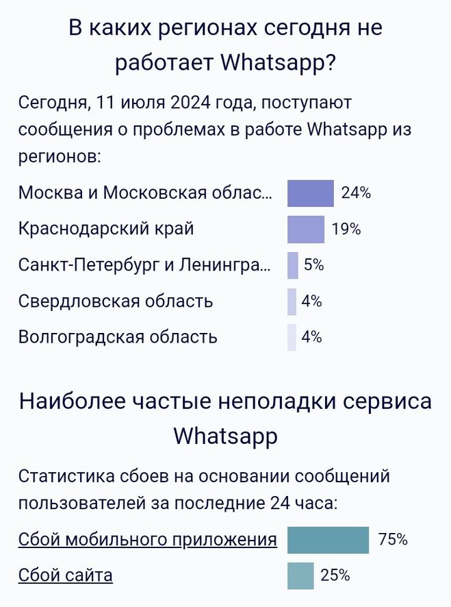 В четверг, 11 июля 2024 года, в городе Москве и Московской области, а также в Краснодарском крае, опять наблюдаются небольшие технические проблемы с доступом в мессенджер "Вотсап". Есть ещё несколько жалоб из других российских регионов, но в целом, по сравнению с несколькими днями раньше, "Вотсап" работает гораздо лучше. В данном случае можно попробовать перезагрузить мобильный телефон, почистить в нëм кэш-память, либо зайти через VPN.