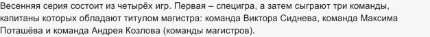 По некоторым причинам в этом году начало весенней серии задерживается относительно прошлых лет. Тут может быть несколько причин, но гадать не имеет смысла, так как в любом случае, скоро игры начнутся, на официальном сайте объявление о начале игр 30 марта 2025 года. О полном расписании весенних игр сегодня можно лишь предполагать. Отборочные игры могут состоятся 6, 13 и 20 апреля.