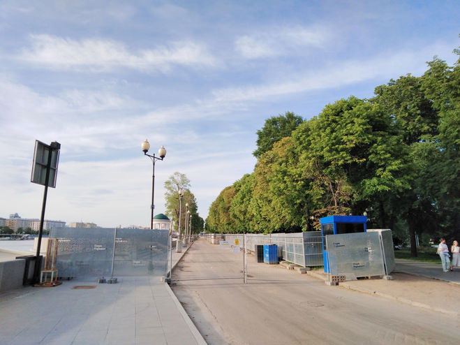 Правда, теперь заграждения не опоясывают опору Андреевского моста, а стартуют сразу за ним, где начинается территория парка Горького. Вся Пушкинская набережная в пределах парка и до Крымского моста заключена в заборы.