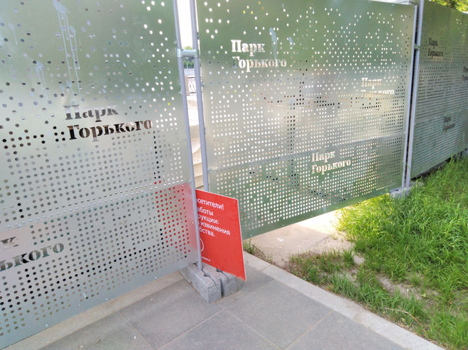 Нигде в заборах нет смотровых окошек, поэтому наблюдать за ходом строительства можно, только если найти где-то дырку в заборе (благо полотно забора перфорированное, и украшено кокетливыми прорезными буквами "Парк Горького").