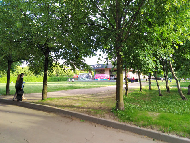 Мощенная плиткой дорожка не везде тянется параллельно стройке. Кое-где она уходит вглубь парка. И в таких местах люди протоптали изрядный "светлый путь". Прямо по газону. Я бы их за это винить не стала: вдоль заборов ходить и так-то безрадостно, а если еще петлять туда-сюда - кому это понравится? Люди спрямляют маршрут, а уж почему в этих местах не проложены временные настилы - вопросы уже не к посетителям парка.