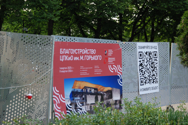 И вот ура-ура! Где-то ближе к началу парка я увидела плакат с хоть какой-то информацией о сроках строительства. Теперь реконструкцию обещают закончить ко II кварталу 2026 года. И даже QR-код влепили: там можно посмотреть, что именно планируют построить.