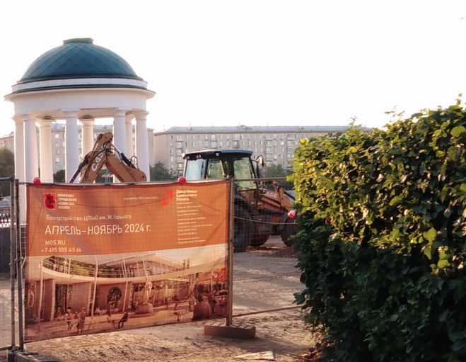 Это тоже фото 2024 года. Бравурная растяжка рассказывала, что ремонт на набережной парка Горького планировали закончить в ноябре 2024 года.