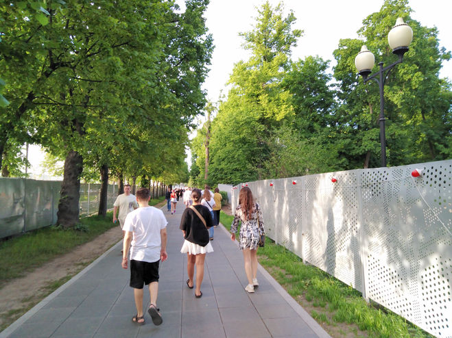 В районе Голицинского пруда с неизменными лодочками ограждение одинарное, и с дорожки можно спокойно свернуть на пруд. К чести работников, дорожка содержится в идеальном состоянии: ни пылинки, ни фантика. Учитывая, что рядом идет стройка, это отличный результат.