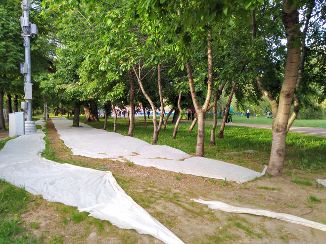 И вот тут заметно, что парковые власти пытаются, конечно, бороться с самопротоптанными дорожками - рыхлят утоптаные участки и пытаются посеять там травку - но всё это напоминает артель "Напрасный труд". Обратите внимание, что народ уже протоптал параллельную дорожку чуть поодаль.
