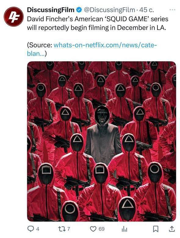 Как стало известно, знаменитый режиссер Дэвид Финчер (известный по таким культовым картинам, как Зодиак, Семь, Девушка с татуировкой дракона и др) уже в декабре 2025 года начнет снимать американскую «Игру в кальмара».