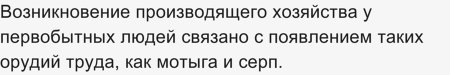 Возникновение производящего хозяйства у первобытных людей связано с появлением таких орудий труда, как мотыга и серп.