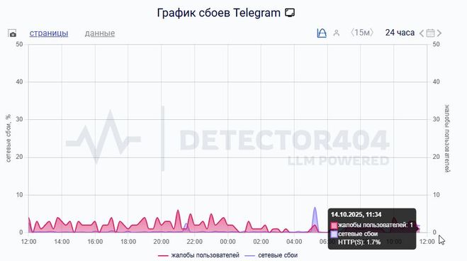 Сегодня вторник 14 октября 2025 года и на момент моего ответа работа популярного мессенджера Telegram не вызывает нареканий. То есть сейчас на работу Telegram всего одна жалоба от пользователей. Так как сейчас сбоев в работе мессенджера нет, то и причин нет. Но ещё впереди день и вечер вторника. Чаще всего если не работает Telegram причина не в самом мессенджере, а в интернет-соединении. Первым делом если телеграм начал сбоить нужно перезапустить интернет на устройстве. А сделать это можно с помощью функции "авиарежим" - нужно просто включить и отключить эту опцию. Вот что сейчас на графике работы Telegram и ещё актуальная информация: