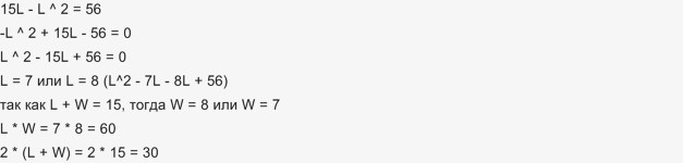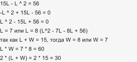 В этом уравнении даже решать его не надо - любому человеку знакомому с таблицей умножения сразу видно, что 56 это произведение 7 и 8, а поскольку и сумма этих цифр как раз 15, то они и есть нужные нам значения сторон прямоугольника.
