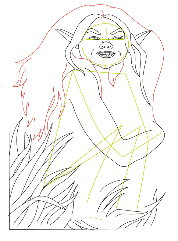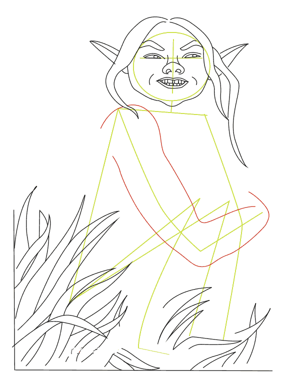 Сначала начнем рисовать кикимору со вспомогательных линий. Затем добавим черты лица, острые уши, как у эльфов, глаза, нос картошкой, сдвинутые брови и рот в ухмылке. Глаза рисуем с хитрым прищуром. Еще добавим прядками волосы.