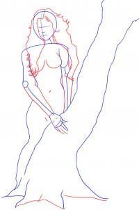 Делаем разметку лица с характерными глазами-тарелками и длинным носом, изогнутым книзу. обозначаем контур волос со спины, парео. Начинаем прорисовку рук.