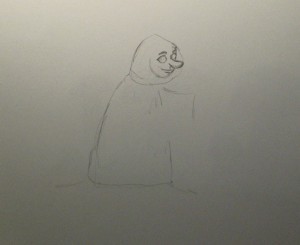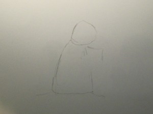 Начнем рисовать старушку в профиль. На голове у нее будет платок, одеяние простое и объемное, похожее на балахон.