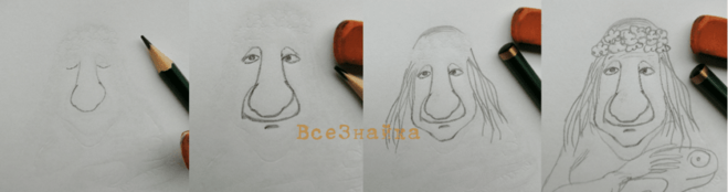 Так что прежде чем рисовать кикимору, необходимо определить какой же у нее будет вид. А тут уже нужно пофантазировать.