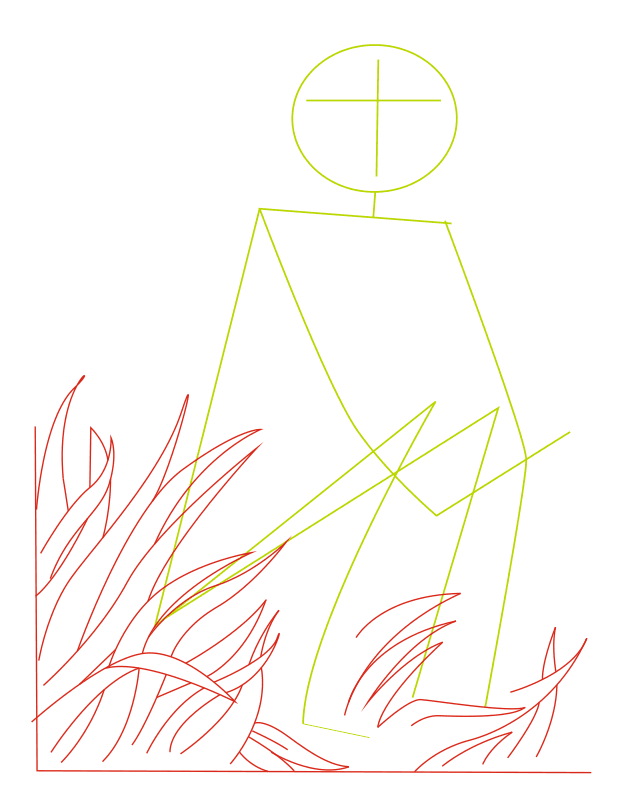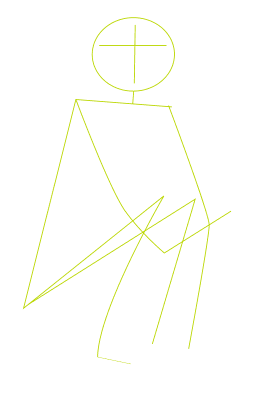 Намётка основного контура. Определяется размер головы и косынки - от него будет зависеть размер тела. Проводим основные линии: вниз - тело, вбок - руки.