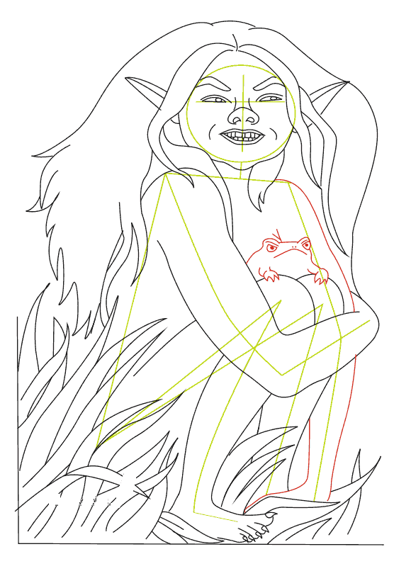 Следом приступим уже к прорисовке тела. Кикимора наша сидит на корточках. Нарисуем ей сначала правую руку, потом левую которой она опирается на траву, прорисуем ноги. На коленях сердитую жабу и фоном - траву, раскрасим используя зеленых болотных оттенков.