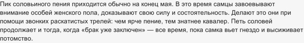 Действительно, соловьи поют только, где-то с середины апреля до середины июня. Своими песнями, соловей выражает свои чувства к самке, которая в это время высиживает яйца. Как только птенцы вывелись, самец петь прекращает, чтобы не привлекать внимания к птенцам, к их гнезду.