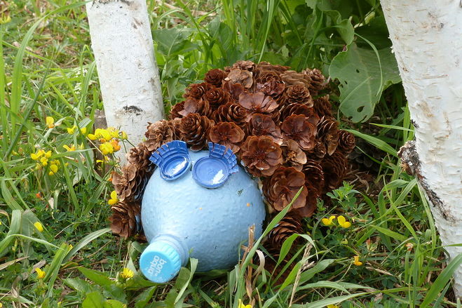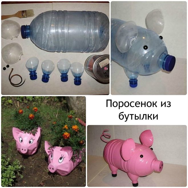 В прошлом году с племянницей делали поделки в детский сад, поскольку ей на тот момент было всего 5 лет, то сделали открытку со свинкой и небольшую поделку свинки из баклажки: